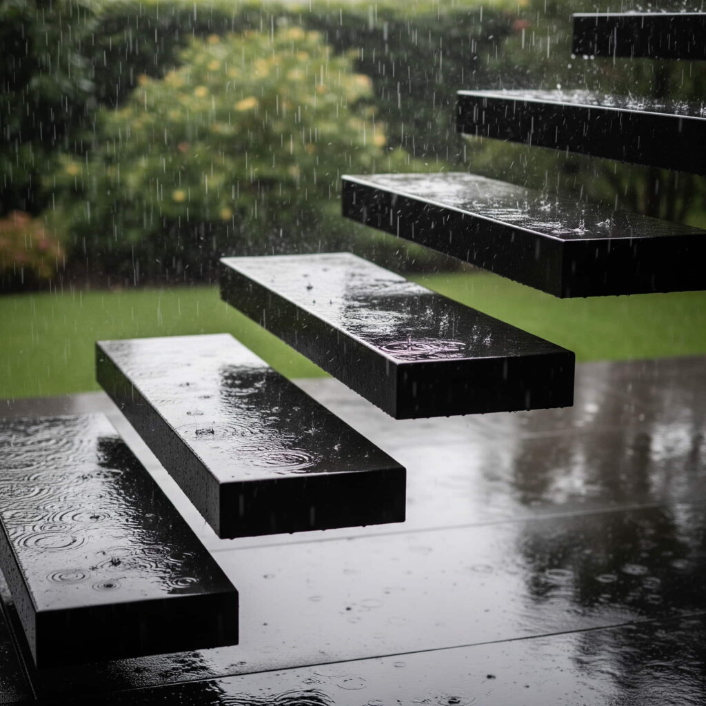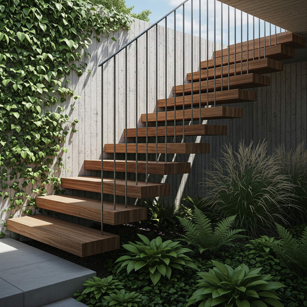 Escaleras flotantes en exteriores: materiales, anclajes y cuidados para que resistan lluvia y sol